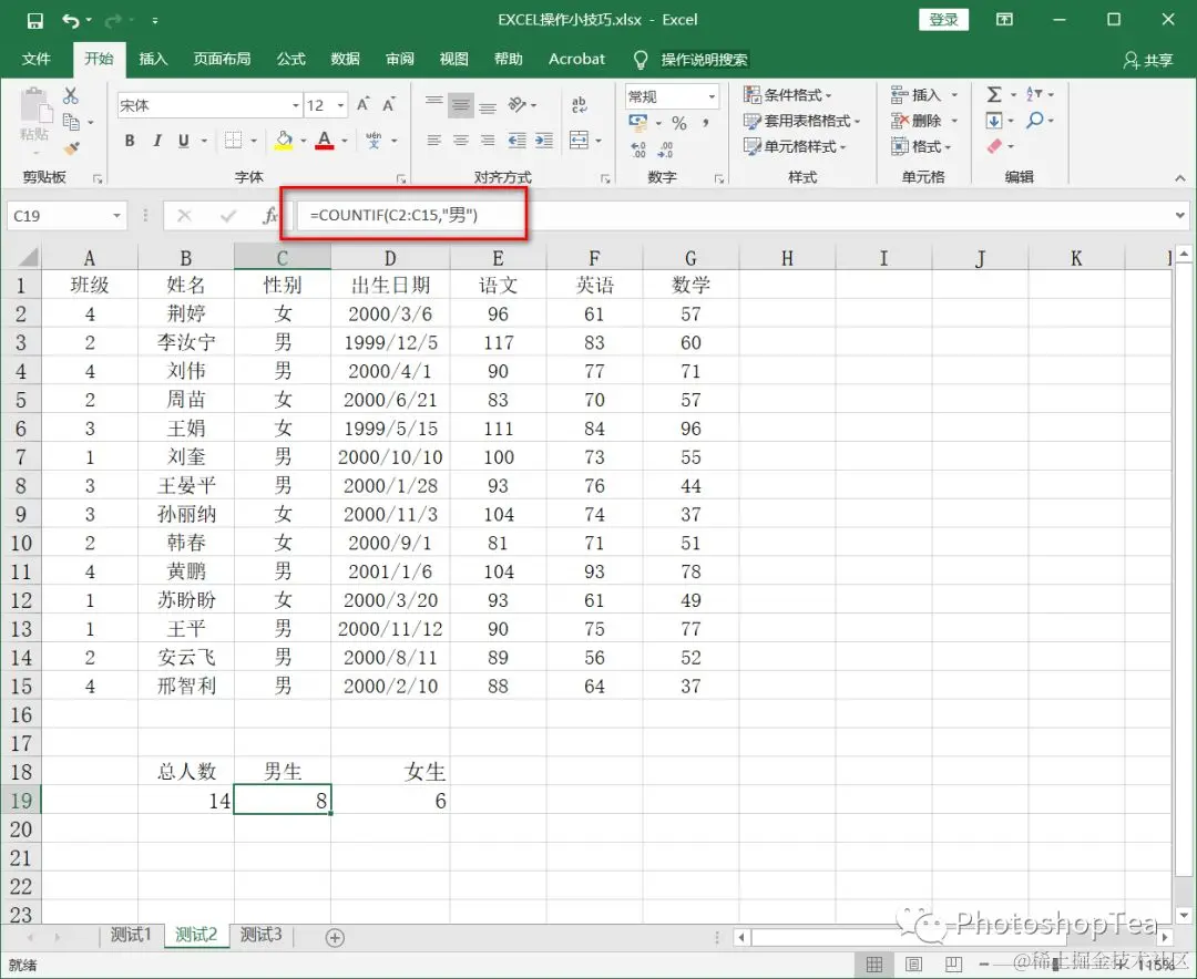 =COUNTIF(C2:C15,"男")