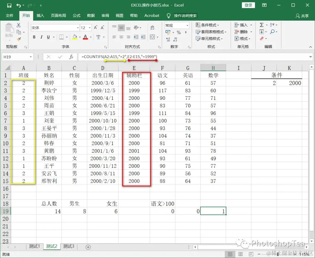 例 2,统计 2 班中 1999 年出生的人数。