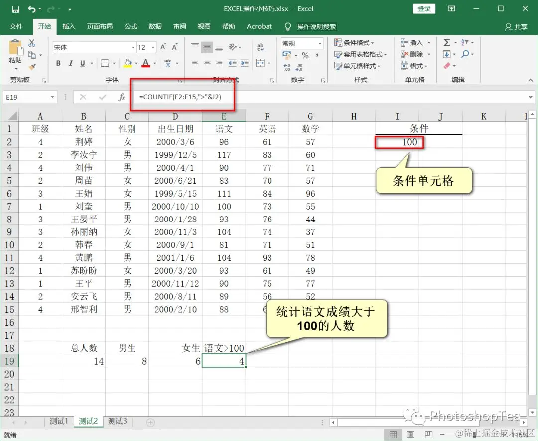 然后在 I2 单元格输入一个分数值,即可统计大于这个分数的人数。