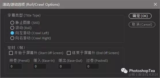 --滚动:常用于制作片尾滚动字幕。请参阅《Pr:制作片尾滚动字幕(旧版标题法)》。