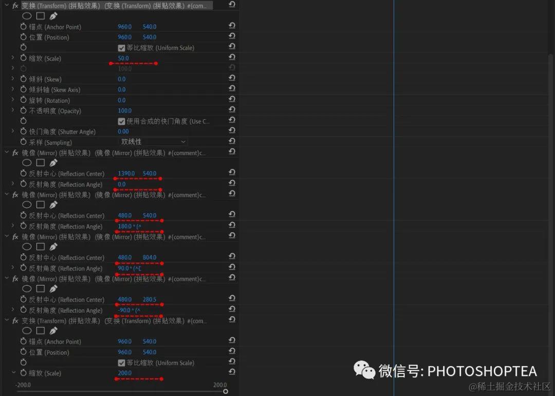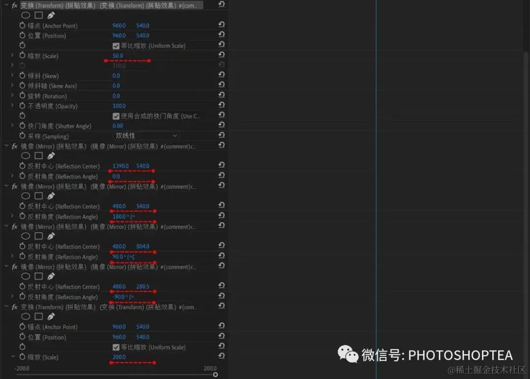 2、添加四个“扭曲/镜像”效果实现重复拼贴,参数见上图。