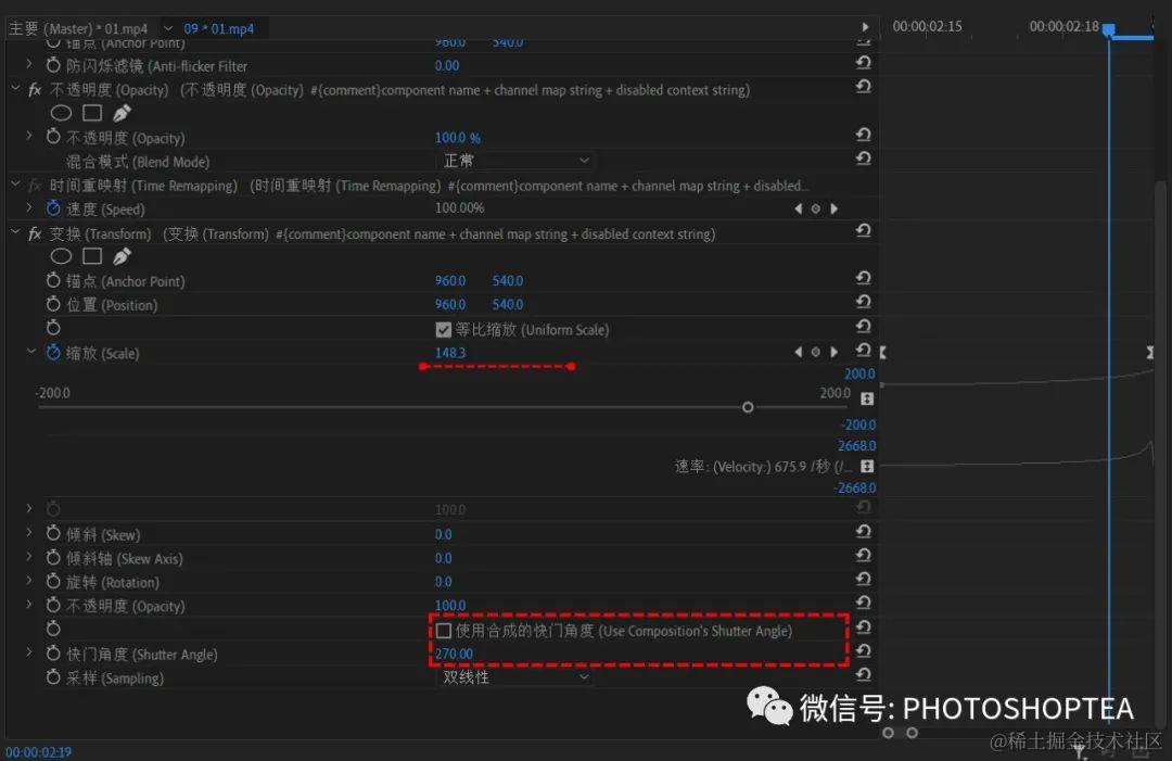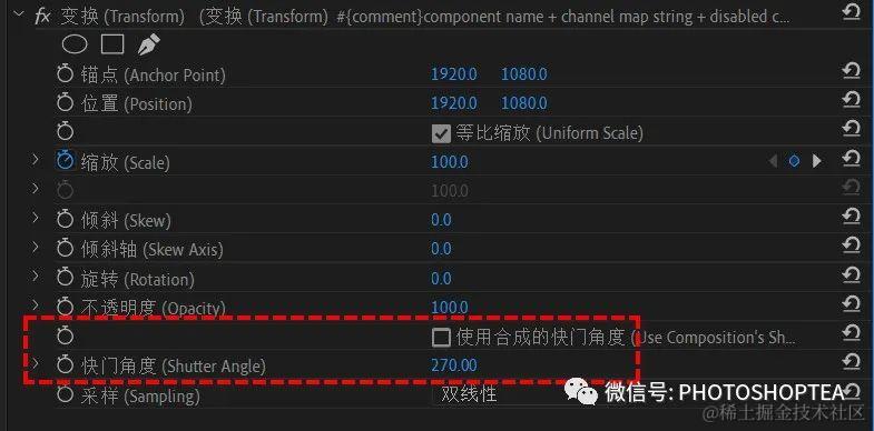 使用“扭曲/变换” Transform效果而不是“运动”效果来实现缩放、平移或旋转,因为变换效果可以实现动态模糊。