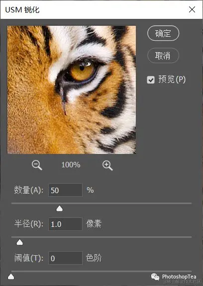 4、如果图像将用于打印输出,可能需要一个比屏幕上看起来合适的锐化效果还要高一些锐化值。