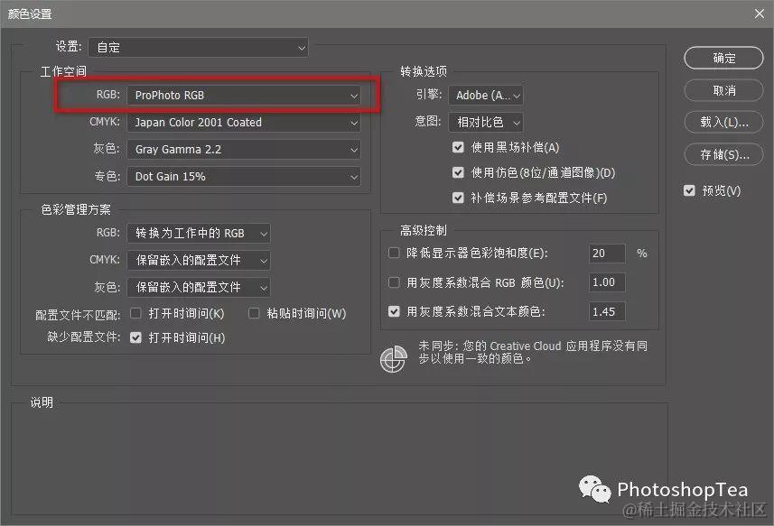 4、Ps 中的颜色设置也可更改为 ProPhoto RGB 色彩空间。