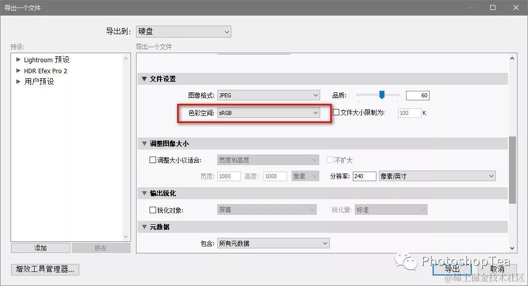 5、用于发布到网络上的照片,色彩空间一定要选 sRGB;对于要打印输出的照片,色彩空间建议为 Adobe RGB 或 ProPhoto RGB。\