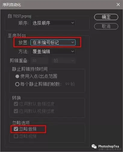在序列自动化对话框中,放置选项设为:在未编号标记。其它选项的设置请参考下图。