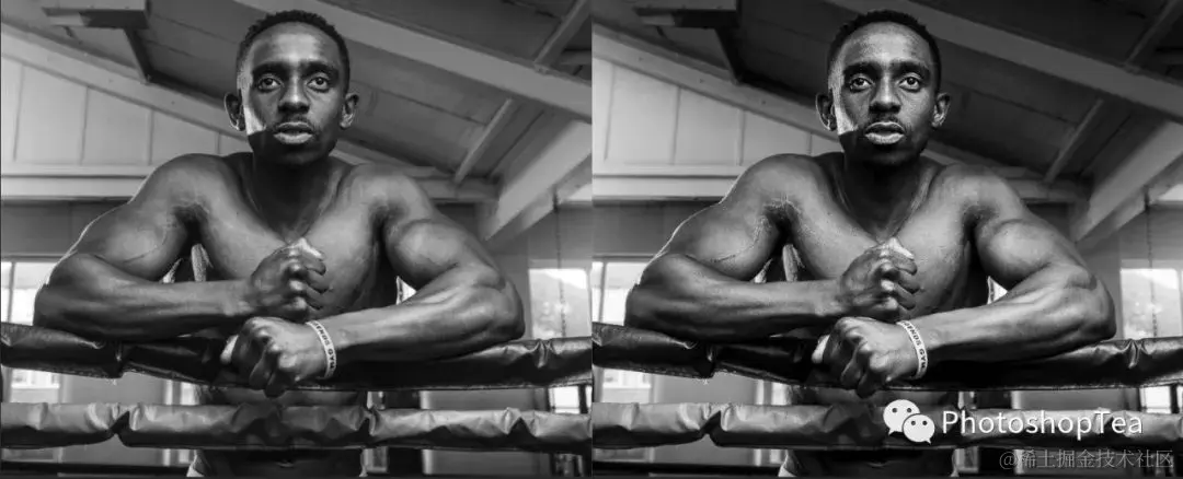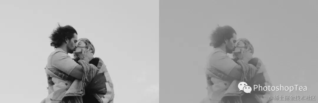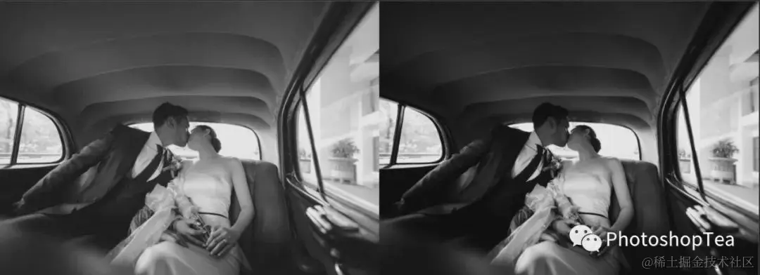 上图中,右边是直接去色得到的原图,会发现照片中男人太黑女人太白,画面不协调。左图是经过局部修饰后的图像。