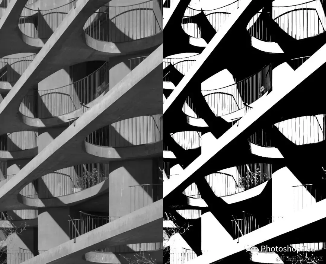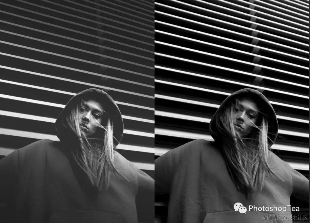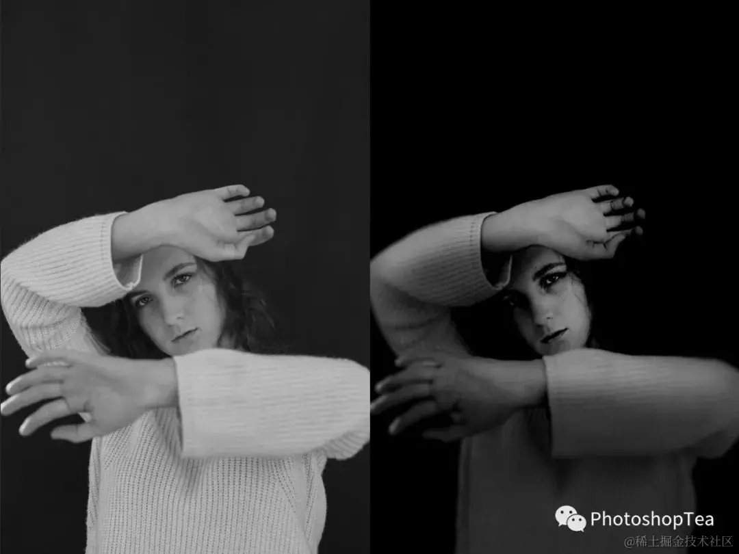 上图中,右边是直接去色得到的图像,照片暗部太黑需要提亮。左边是经过曲线提亮后,并通过混合颜色带恢复了原图的高光。
