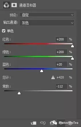 一般使用通道混合器调整图层转换为黑白,