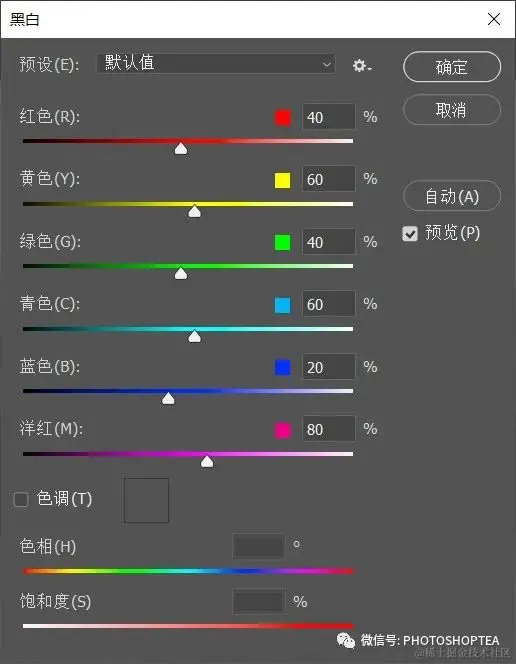 注意:黑白命令比黑白调整图层多出了调整单色的色相和饱和度的滑块。