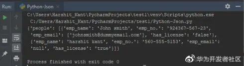 import jsonpeople_string = '''{"people":[{"emp_name": "John smith","emp_no.": "924367-567-23","emp_email": ["johnsmith@dummyemail.com"],"has_license": "false"},{"emp_name": "harshit kant","emp_number": "560-555-5153","emp_email": "null","has_license": "true"}]}'''data = json.loads(people_string)print(data)