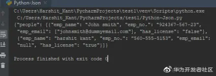 import jsonpeople_string = '''{"people":[{"emp_name": "John smith","emp_no.": "924367-567-23","emp_email": ["johnsmith@dummyemail.com"],"has_license": "false"},{"emp_name": "harshit kant","emp_no.": "560-555-5153","emp_email": "null","has_license": "true"}]}'''data = json.loads(people_string)new_string = json.dumps(data)print(new_string)