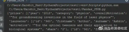 import pandas as pdimport json with open(r'C:UsersHarshit_KantDesktopnobel.prize.json') as f: data = json.load(f)print (data) df = pd.DataFrame print(df)