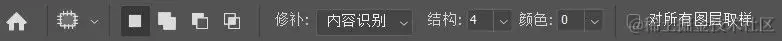 1、照片污点修复时,通常选择工具选项栏的“内容识别” Content-Aware。