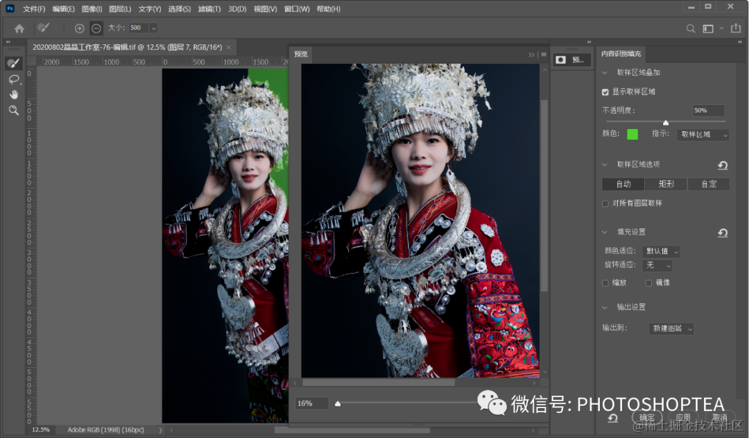 2、按 Ctrl/Cmd 键点击上述的空白图层,转换为选区,之后隐藏该图层。选中照片图层后,执行Ps菜单:编辑/内容识别填充。