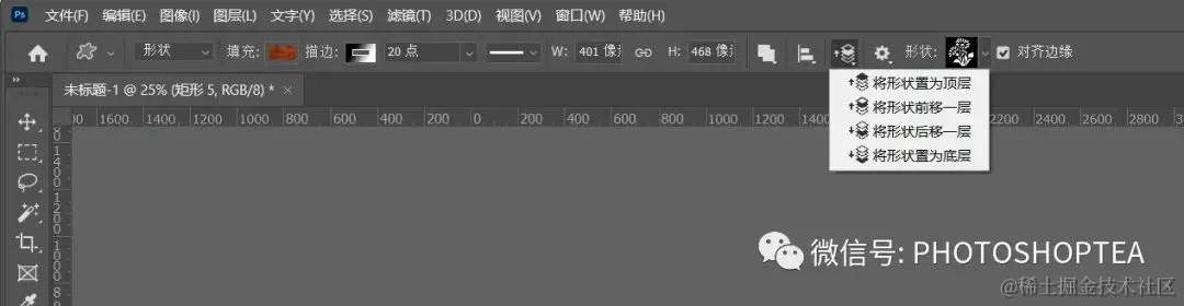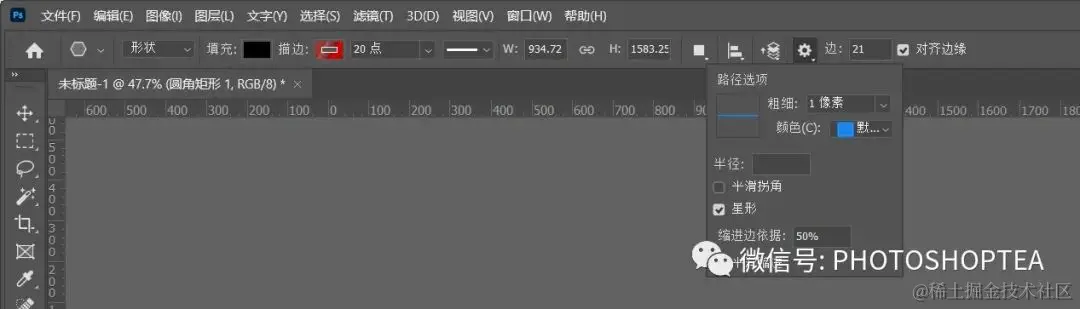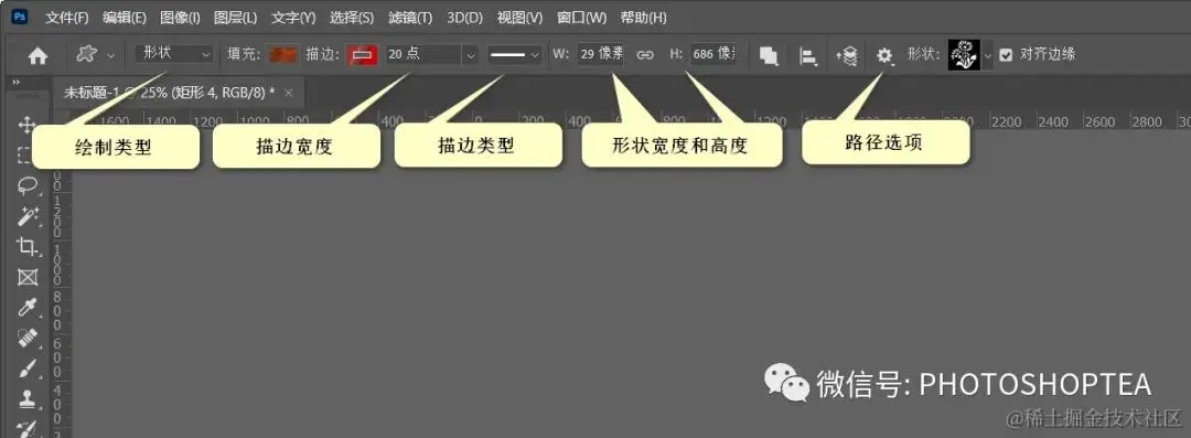 1、使用工具选项栏改变形状,包括填充 Fill、描边 Stroke、宽度 W、高度 H等。