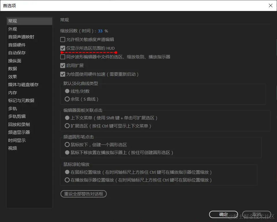 调整振幅旋钮,又称为HUD(Heads-Up Display,平视显示器)。左右拖动(或直接输入数值)改变整个音频或选区的振幅,松手后回归到 0 dB。因此,如果要撤销操作,可以按 Ctrl/Cmd + Z,或者使用历史记录面板。