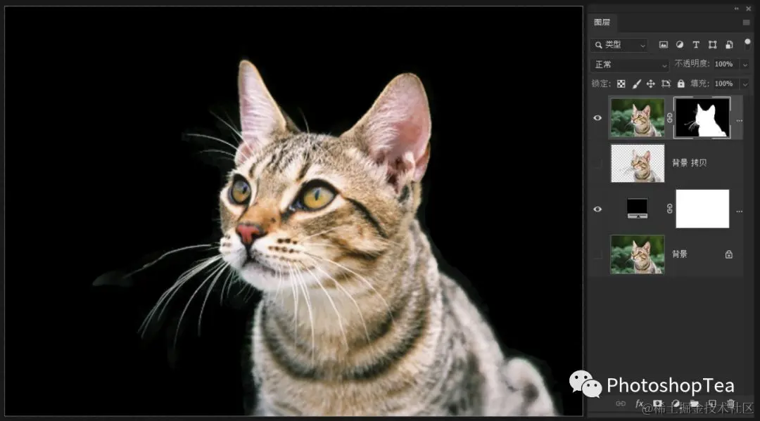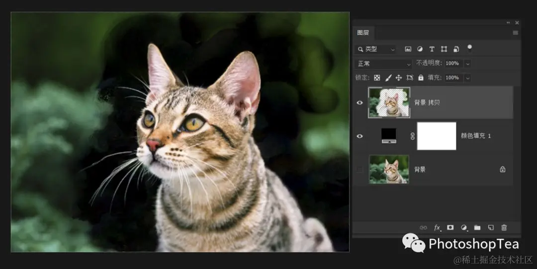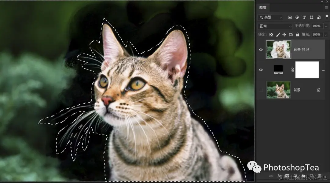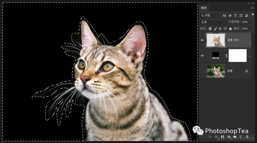 复制背景图层,并置入图层面板最上层。按 Ctrl/Cmd 键点击擦除了像素的图层,然后将选区作为最上图层的蒙版。