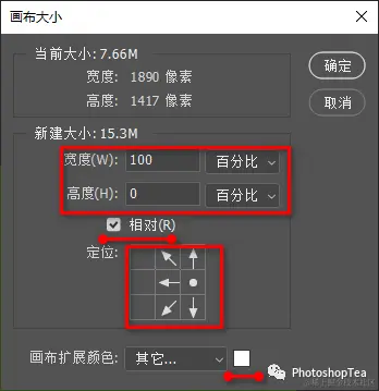 改变画布大小前,先选择右侧单位列表,常用的单位有:像素、百分比、英寸、厘米等,并确认下侧的“相对” 框是否勾选以及“定位”的方向,再输入宽度 Width及高度 Height值。