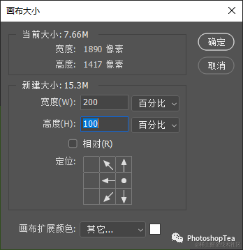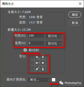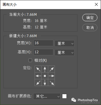 改变画布大小前,先选择右侧单位列表,常用的单位有:像素、百分比、英寸、厘米等,并确认下侧的“相对” 框是否勾选以及“定位”的方向,再输入宽度 Width及高度 Height值。