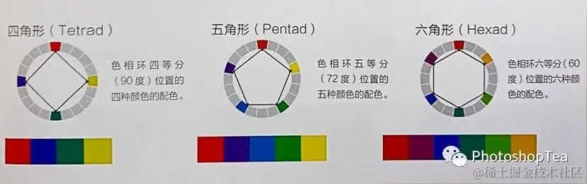 色相环五等分( 72° )位置的五种颜色的搭配。