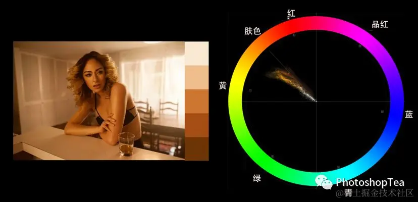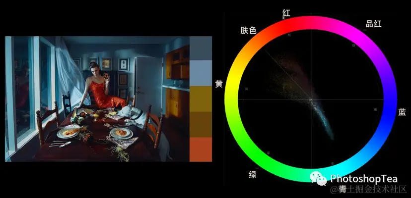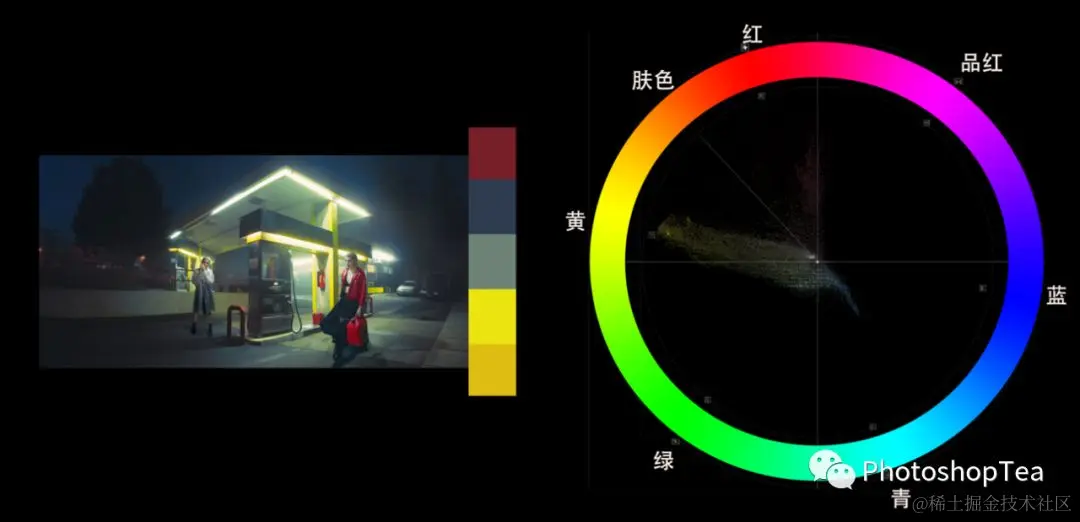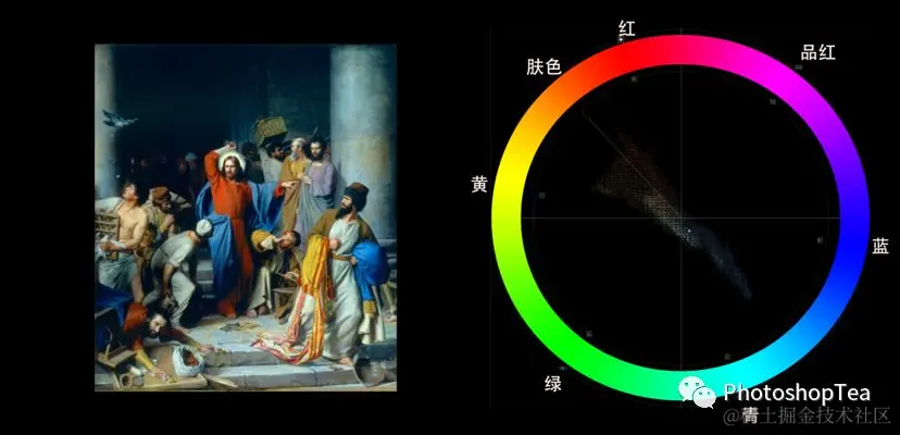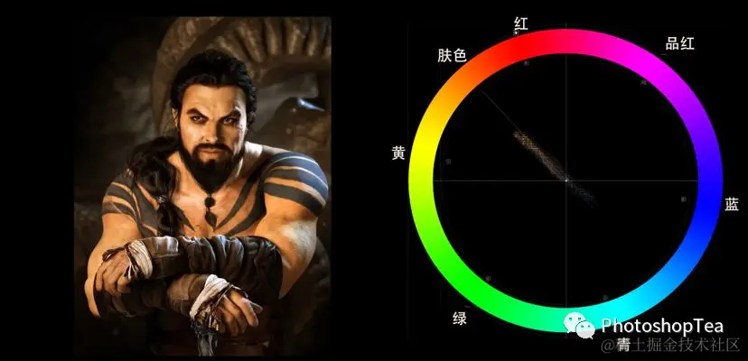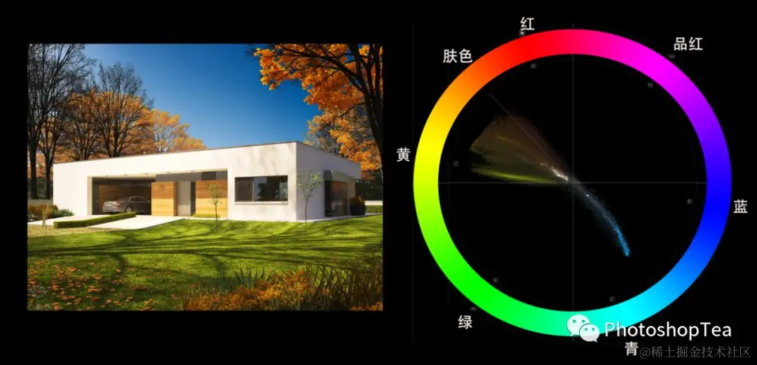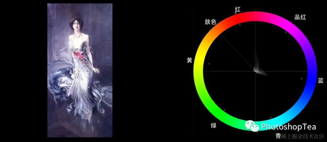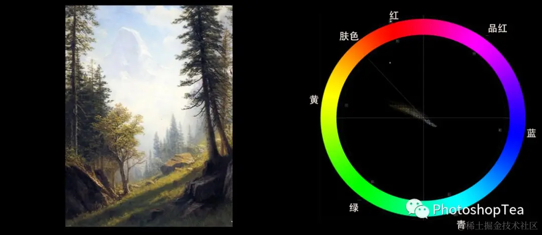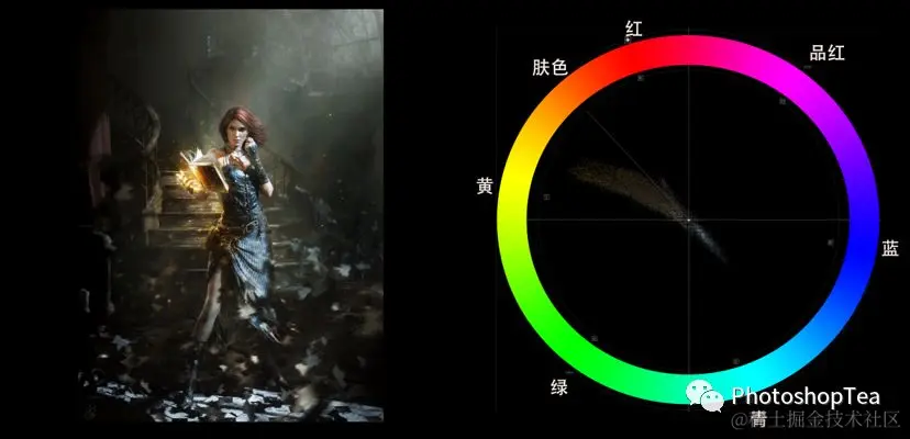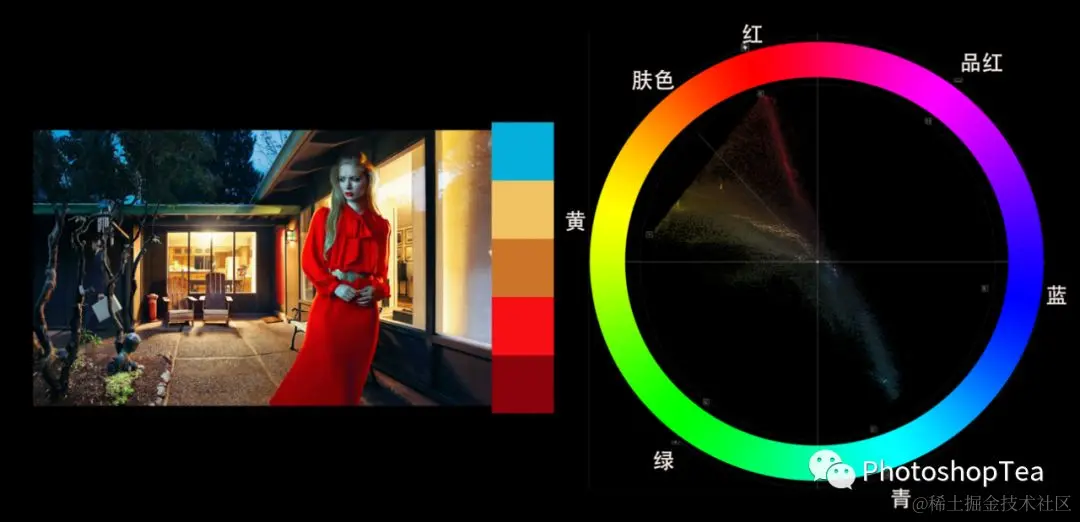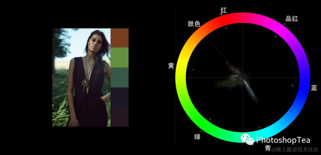 分离互补色 Split Complementary,选择一种颜色,与它的补色在色轮的左侧或右侧的色相进行组合,即可得到分离互补色。在矢量示波器上表现为几何体—等边三角形。