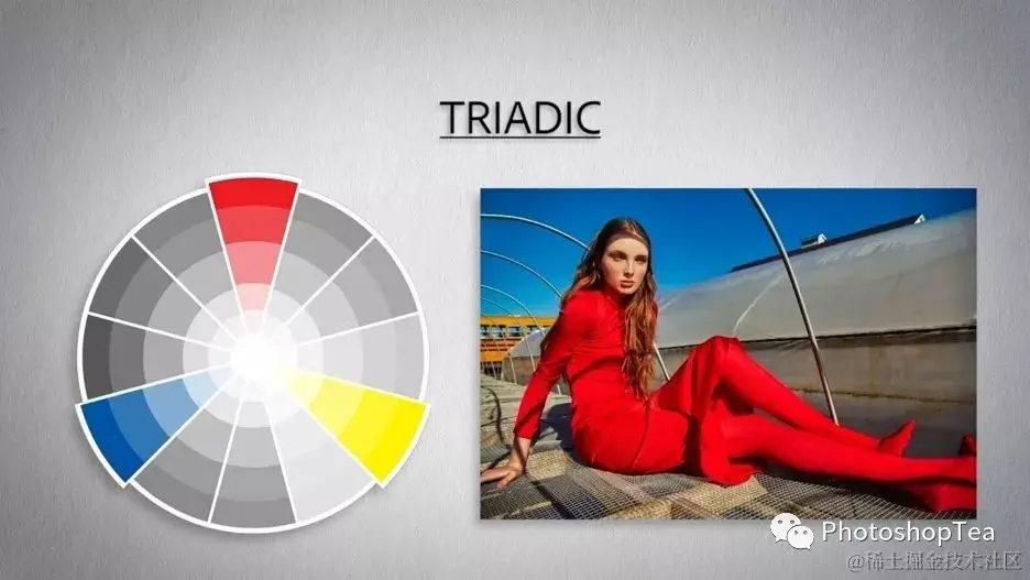 三元群 Triad,两两之间由于含有较少共同的色彩,因此对比性较强,不容易形成统一的色调,应用时需要加入一些调和的手段。