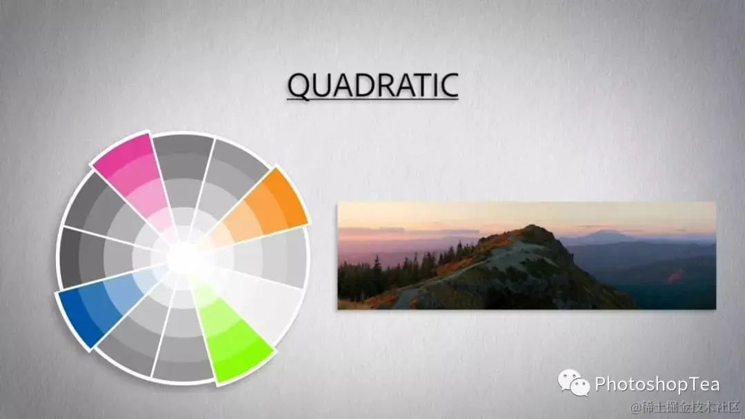 双分离互补色 Double Split Complementary,两对互补色的组合,在矢量示波器上表现为几何体—四边形。