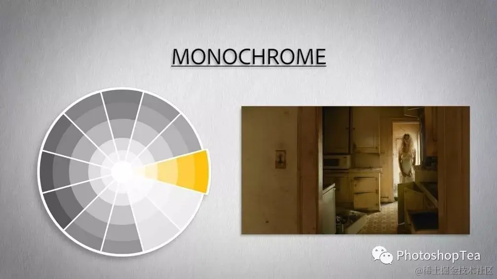 单色 Monochrome,也称同色、相近色,其极致是单色,同种色相的暗、中、亮调的组合。