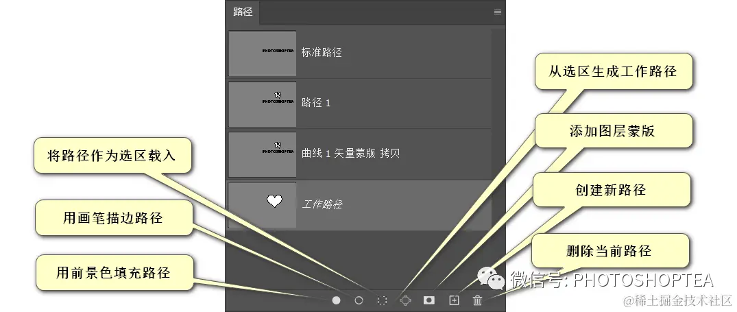 大部分路径面板上的操作可在面板控制菜单和面板下方的按钮组中找到。