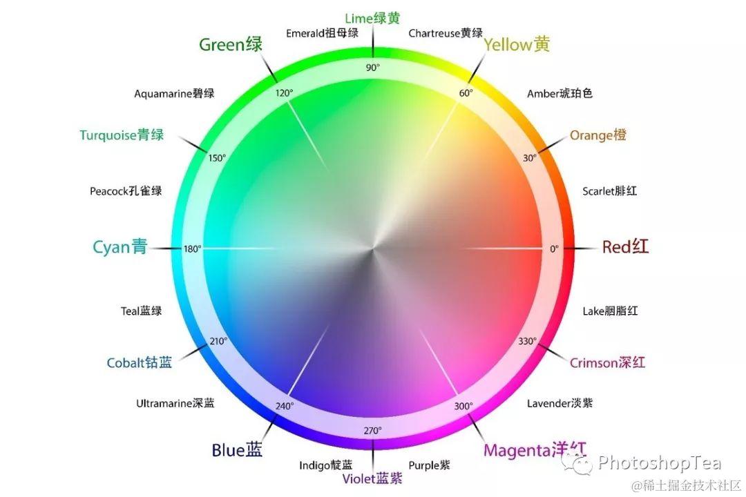 平常说的什么样的颜色,就是指色相。Ps中用 0 ~ 360° 的色相值来表示各种不同的颜色。如,红色的色相值为 0° (或 360° ),青色的色相值为 180° ,等等。