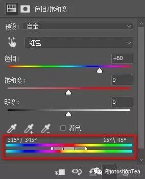 色相滑块的值在 -180° ~ +180° 之间,表示以当前颜色以基点,往右或往左拖动滑块,该色相值相对增加或减少多少度,需结合色相轮才能更好地判断。