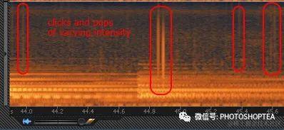 在用黑胶唱片 Vinyl制作的录音中,咔嗒声 Click是很常见的。数字音频信号中偶尔出现的时钟错误、录制旁白时出现的麦克风爆音、不良的物理音频连接等都可能会导致这种咔嗒声或噼啪声。这些噪音在频谱图上表现为反复出现的短脉冲垂直条块。
