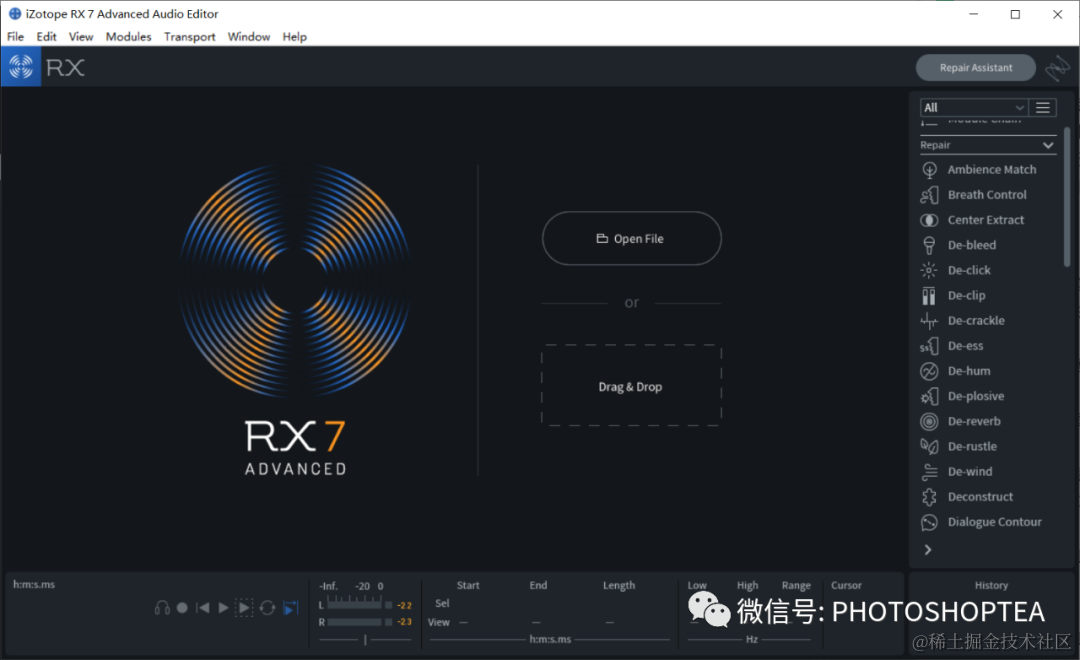 音频修复工作可考虑使用第三方插件。iZotope RX 7是一款行业标准级音频修复软件,提供了各种修复工具。既是一款功能强大的独立软件,也为宿主软件如Au等提供了VST插件。 在很多的情况下,它可以自动完成降噪修复处理,且效果良好。