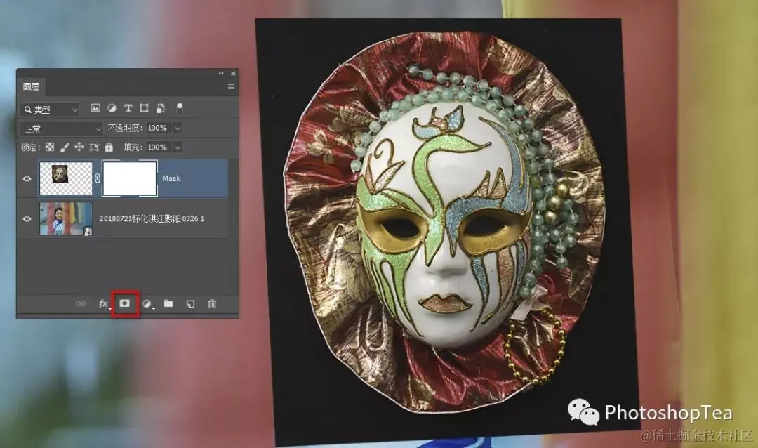 点击图层面板上的“添加图层蒙版”按钮,则建立一个白色蒙版。如果按住 Alt/Opt 键点击“添加图层蒙版”按钮,则会建立一个黑色蒙版。