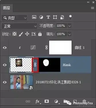 默认情况下,新建的蒙版与是链接的(见下图)。这意味着进行放大缩小、移动等操作时,图层内容与蒙版内容同步进行。
