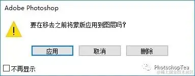 如果选择“应用”,则对应蒙版上黑色区域的图层图像将被删除,对应白色区域的将被保留。一般选择“删除”。