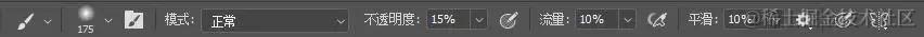 柔边圆画笔,硬度:0%,不透明度:15%,流量:10~20%。