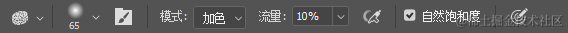 工具参数建议:模式:加色,即增加饱和度。去色:即减少饱和度;流量:10~20%;自然饱和度:勾选。