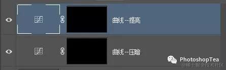 建立双曲线的方法:建立两个曲线调整图层,一个提亮,一个压暗,两个均使用黑色蒙版,并将混合模式都改为“明度”。