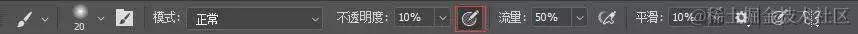 关闭大小压感(形状动态),打开不透明度压感(传递),不透明度10~20%,流量20~50%。
