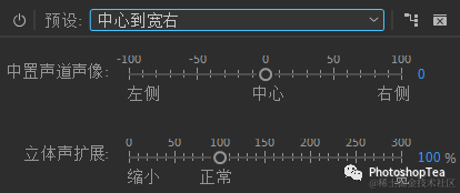 中置声道声像 Center Channel Pan:将立体声声像的中心从极左 (-100%) 的某个位置定位到极右 (100%)。