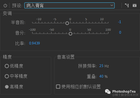 --拼接频率 Splicing Frequency:确定每个音频数据块的大小。音高换档器效果将音频分为非常小的块进行处理。该值越高,伸缩的音频随时间的放置越准确。不过,随着值的提高,人为噪声也变得更明显。使用较高的精度设置和较低的拼接频率可能会增加断续声或回声。如果频率太高,声音会变得很细弱,人声像是从隧道里发出来的。