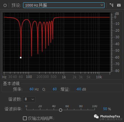 消除嗡嗡声效果可去除窄频段及其谐波。最常见的应用可处理照明设备和电子设备的电线嗡嗡声。也可用作陷波滤波器,以从源音频中去除过度的谐振频率。