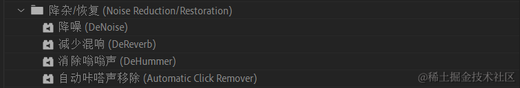 来自无线麦克风或旧黑胶唱片的噼啪声,可考虑使用自动咔嗒声移除效果。类似风的隆隆声、磁带嘶嘶声或电线嗡嗡声的背景噪声,可考虑使用自适应降噪效果(过时)或消除嗡嗡声效果等。