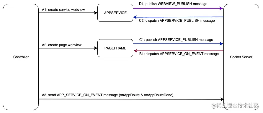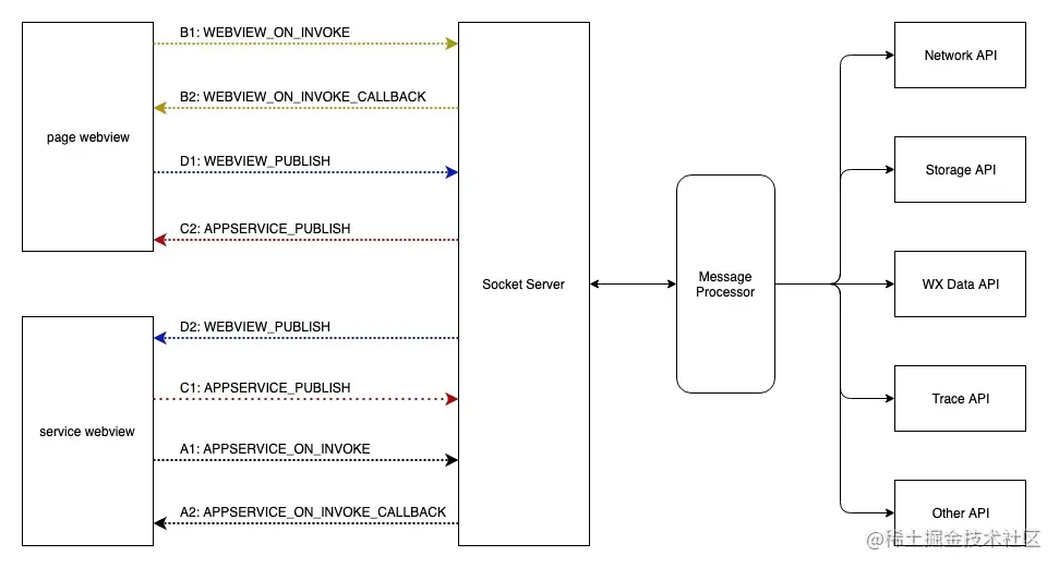 这个图如果你们深入研究过这块内容的应该都可以看懂 service webview socket 之间的关联,下面我还是会简述一下。