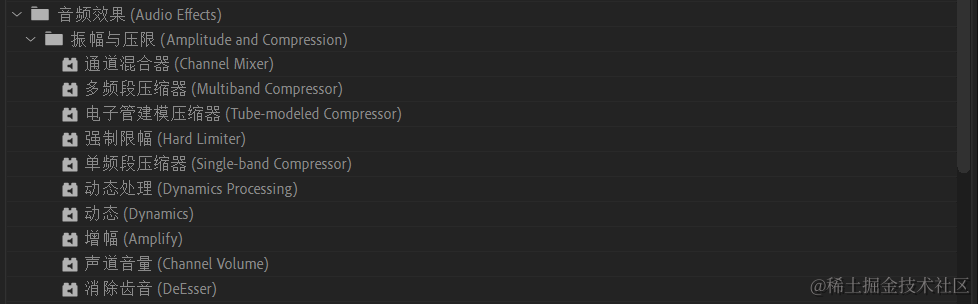 Pr:效果面板/音频效果/振幅和压限