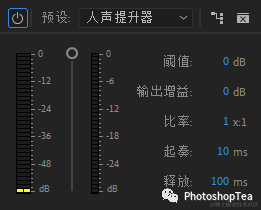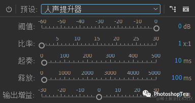 --起奏时间 Attack Time:确定输出信号达到指定电平所需的毫秒数。例如,如果音频突然下降 30 dB,在经过指定的起奏时间后,输出电平才会发生变化。