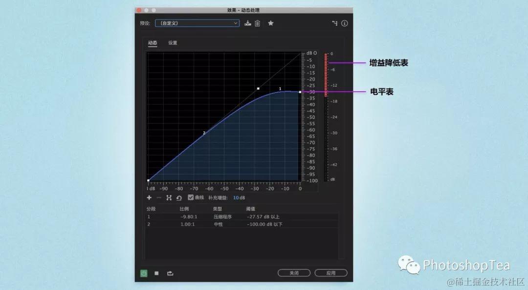 在动态处理效果中,可以查看电平表和增益降低表。电平表显示音频的输入电平,增益降低表显示音频信号的压缩或扩展方式。