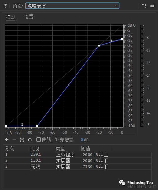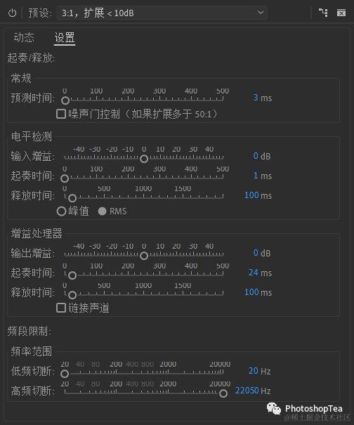通过衰减低于指定阈值 Threshold的音频来增加音频信号的动态范围。比例 Ratio可以用于控制动态范围的更改。